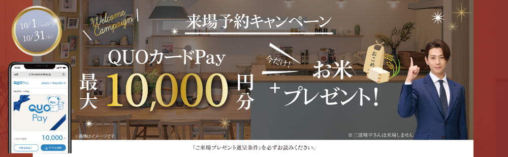 当日および1日前にご来場のお客様は、2回目の来店時(事前審査申込後)にQUOカードPay 10,000円分+お米2キロを進呈させて頂きます。